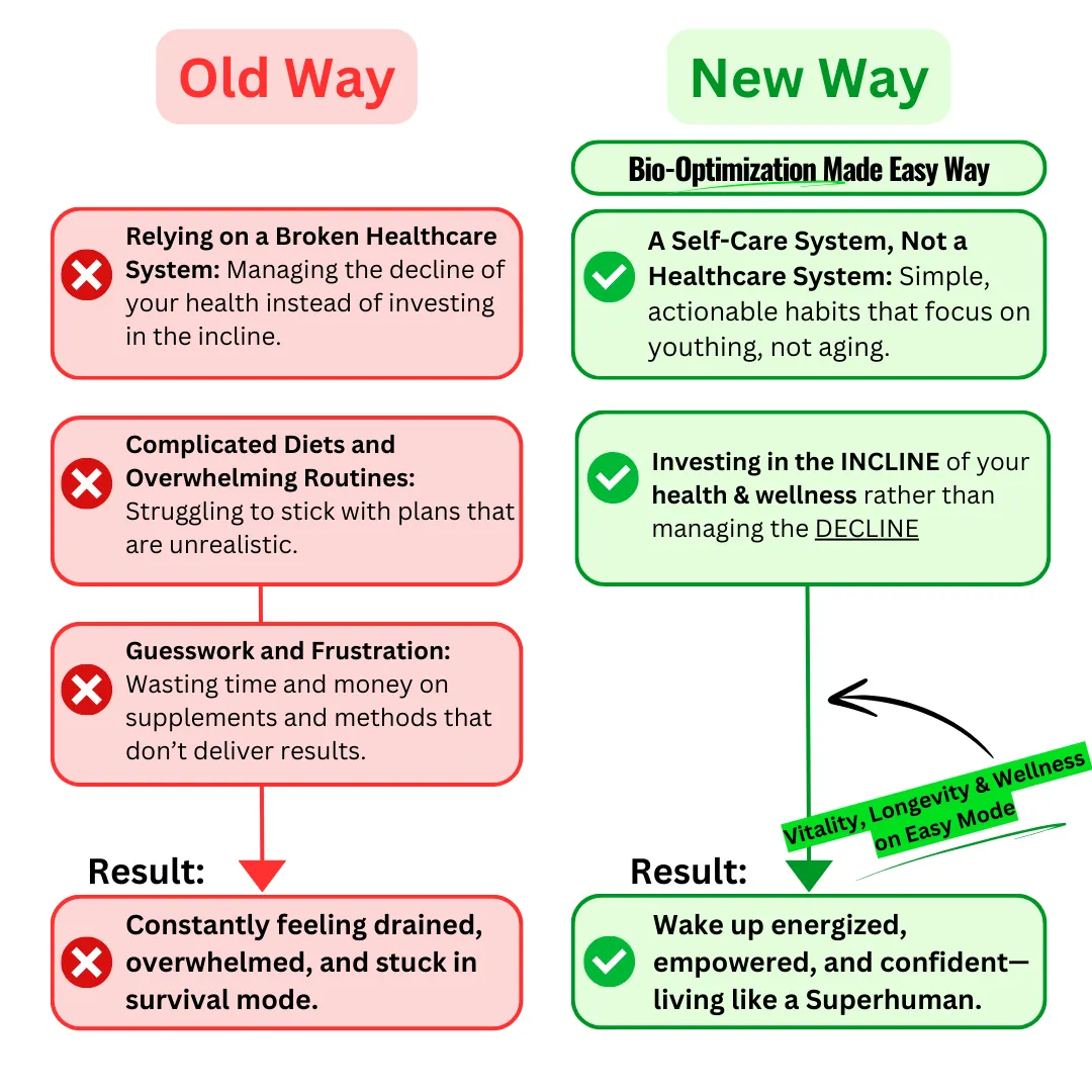 Bio-Optimization Made Easy is a groundbreaking, science-backed approach to reclaiming your energy, vitality, and wellness. It allows you to feel younger, stronger, and more balanced without complicated diets, exhausting workouts, or overwhelming routines.
